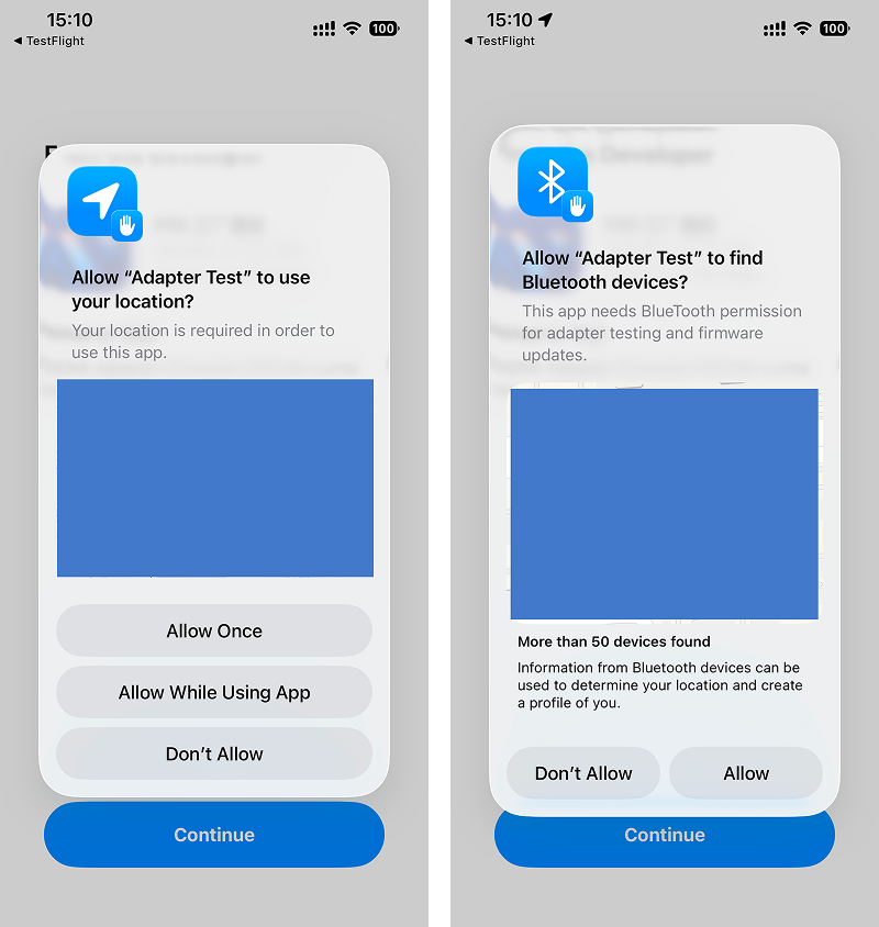 Launch the Test App: Open the app and allow Location and Bluetooth permissions (required for Bluetooth communication). Then tap Start Testing.