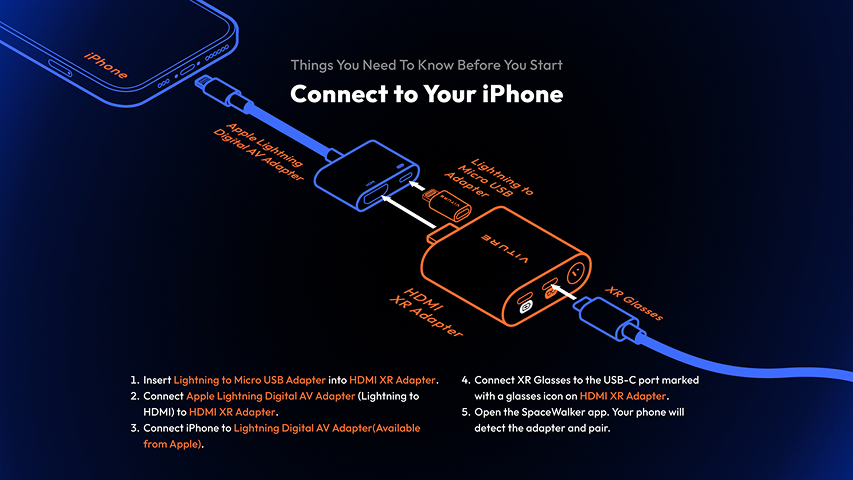 To access multiple virtual screens and VR video playback, just open the SpaceWalker app. The HDMI XR Adapter will detect and pair with your iPhone automatically.